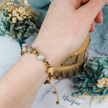 Obwód regulowany jest za pomocą węzła makramowego, co ułatwia zakładanie i zdejmowanie bransoletki oraz pozwala na wygodne dopasowanie do nadgarstka.