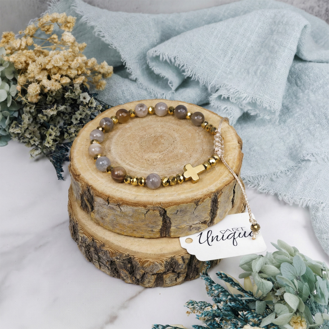 ➤ Rodzaj i kolor kamieni: kamień słoneczny w odcieniach szarości i beżu oraz złoty hematyt.