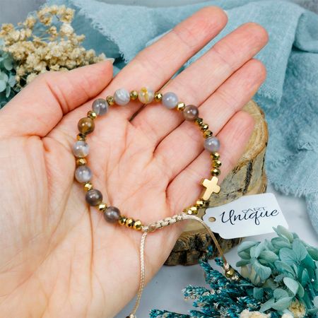 Różaniec w formie bransoletki, wykonany z naturalnych kamieni półszlachetnych – kamienia słonecznego i hematytu – nawleczonych na wodoodporny sznurek.