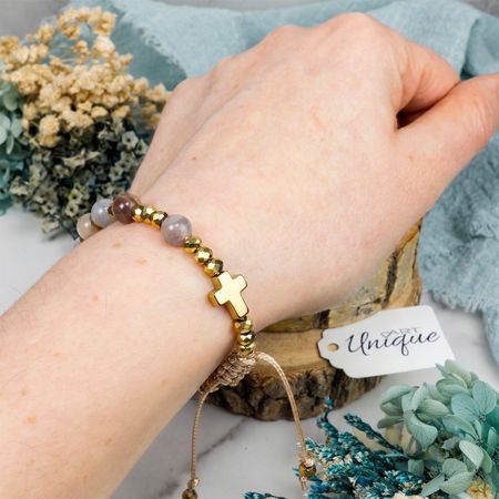 Obwód regulowany jest za pomocą węzła makramowego, co ułatwia zakładanie i zdejmowanie bransoletki oraz pozwala na wygodne dopasowanie do nadgarstka.