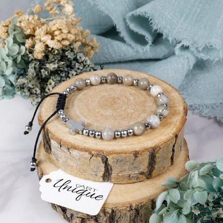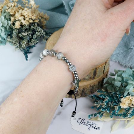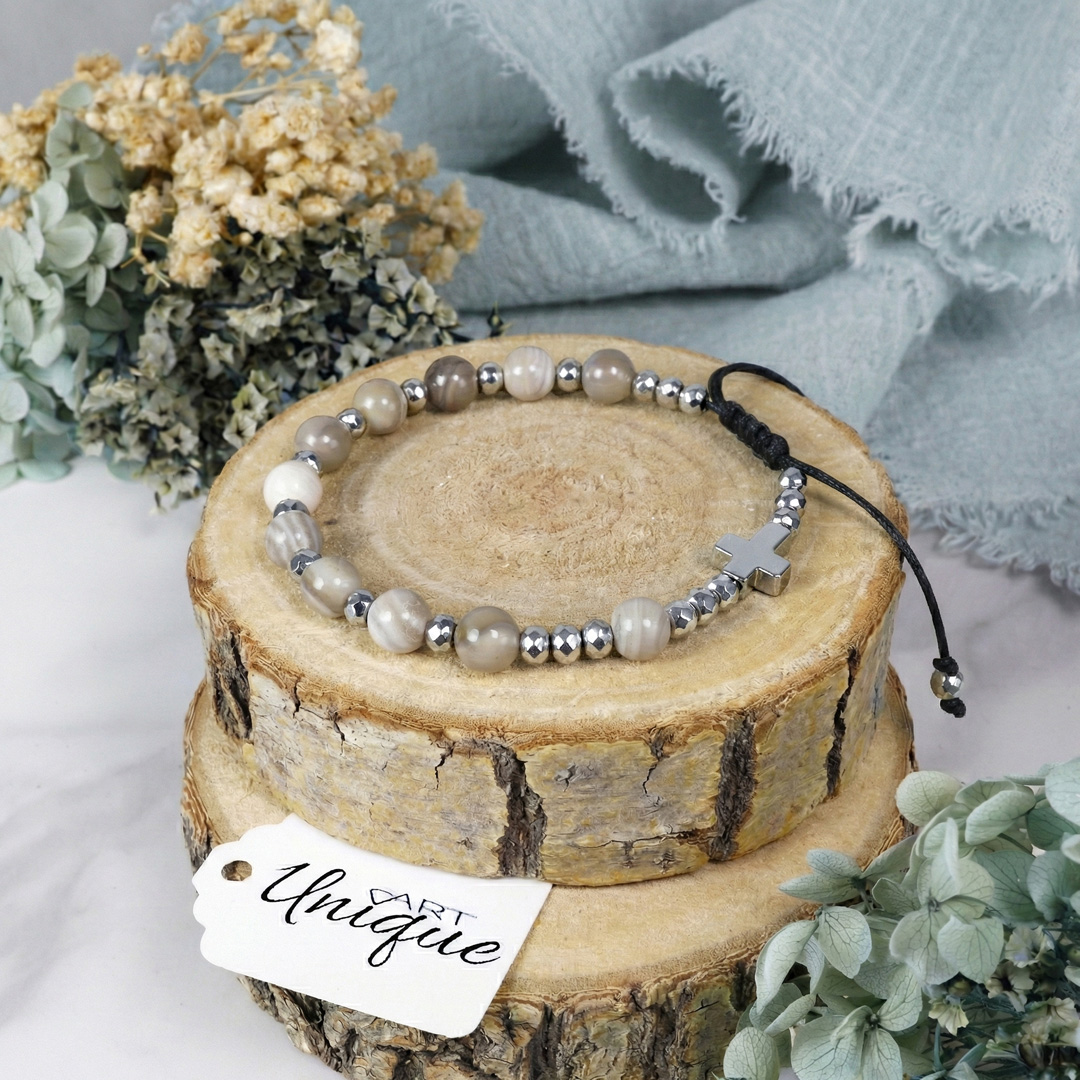 Różaniec w formie bransoletki, wykonany z naturalnych kamieni półszlachetnych – krzemienia pasiastego i hematytu – nawleczonych na wodoodporny sznurek.