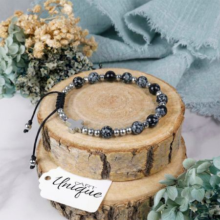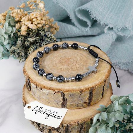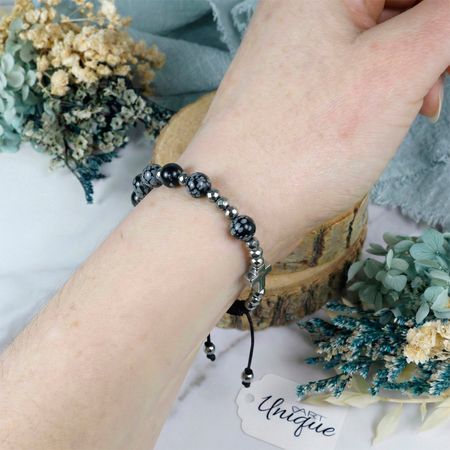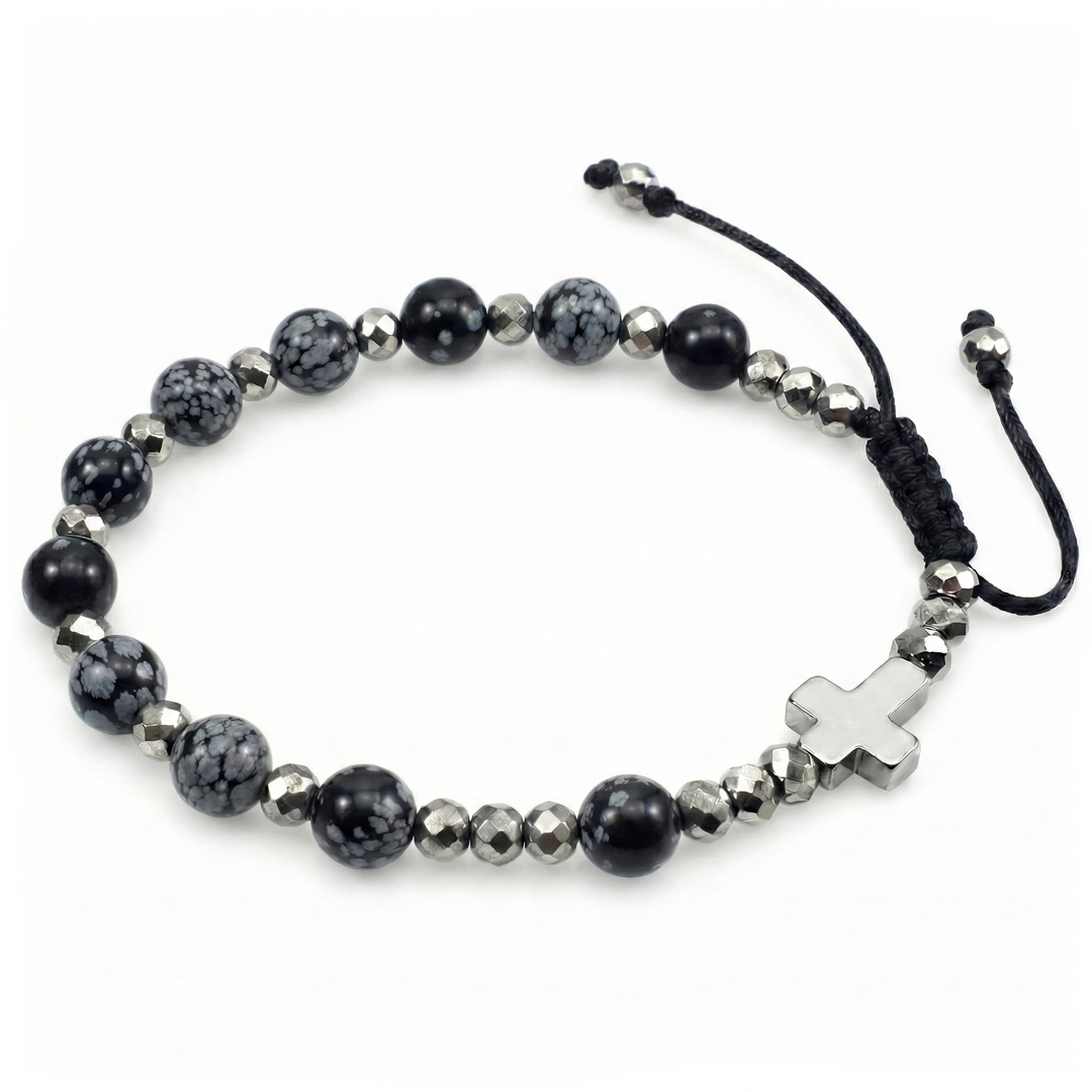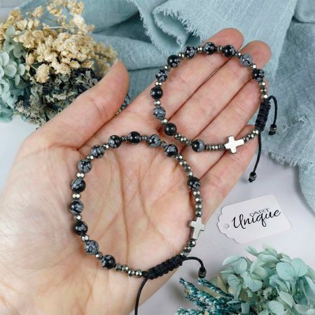 Różaniec w formie bransoletki, wykonany z naturalnych kamieni półszlachetnych – obsydianu śnieżnego i hematytu – nawleczonych na wodoodporny sznurek.