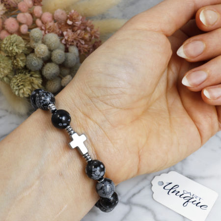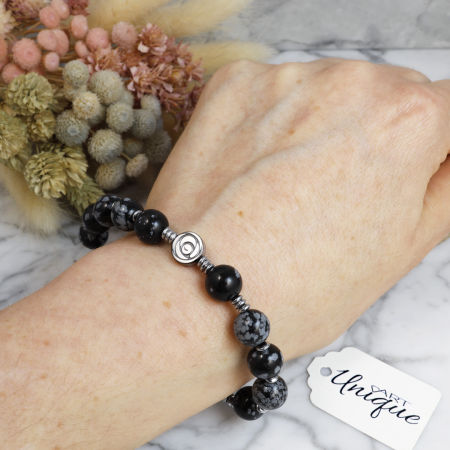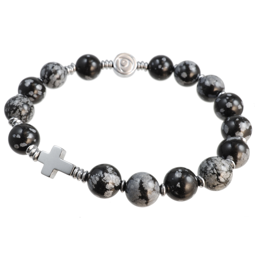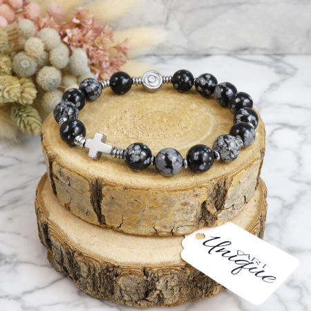 Różaniec wykonany w całości z naturalnych, ozdobnych kamieni półszlachetnych - obsydianu śnieżnego i srebrnego hematytu na mocnej, silikonowej gumce jubilerskiej.