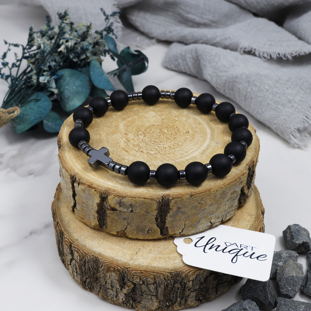 Damska / chłopięca bransoletka różaniec na rękę ✞ onyks matowy, hematyt CRB030