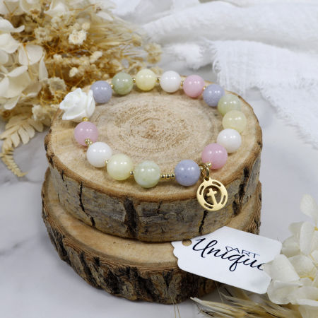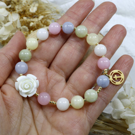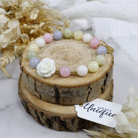 Bransoletka wykonana z kamieni ozdobnych - cukierkowych jadeitów, róży z laki w kolorze białym na mocnej, silikonowej gumce jubilerskiej. Całość dopełnia przywieszka ze stali nierdzewnej w kolorze złotym.