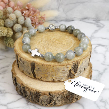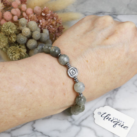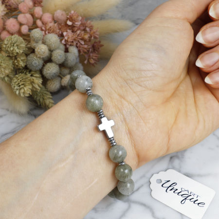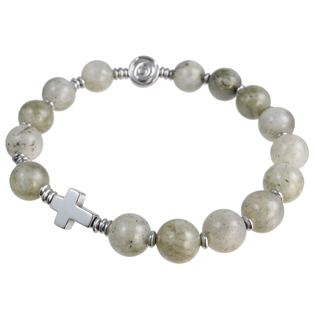 Różaniec wykonany w całości z naturalnych, ozdobnych kamieni półszlachetnych - szarego labradorytu i srebrnego hematytu na mocnej, silikonowej gumce jubilerskiej.