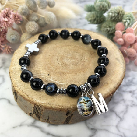 Różaniec wykonany z naturalnych kamieni półszlachetnych - agatu pasiastego czarnego i hematytu na mocnej, podwójnej gumce silikonowej.