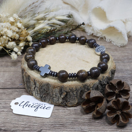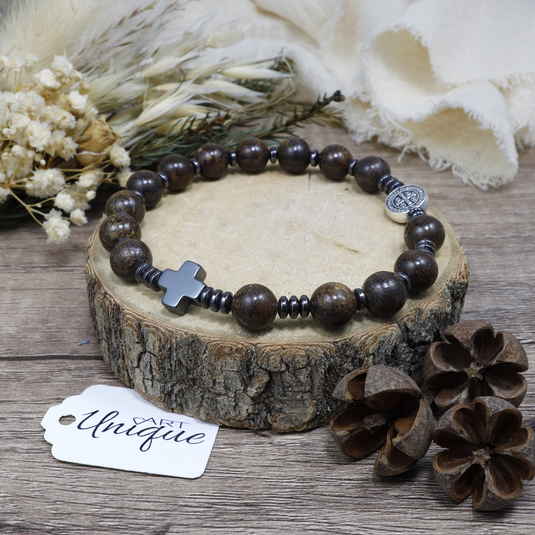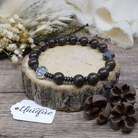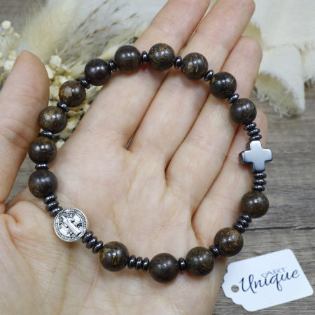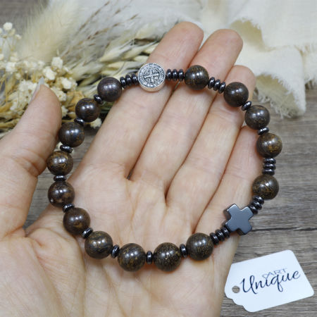 Bransoletka wykonana z kamieni ozdobnych - bronzytu i hematytu z medalionem Św. Benedykta na mocnej, podwójnej gumce silikonowej.